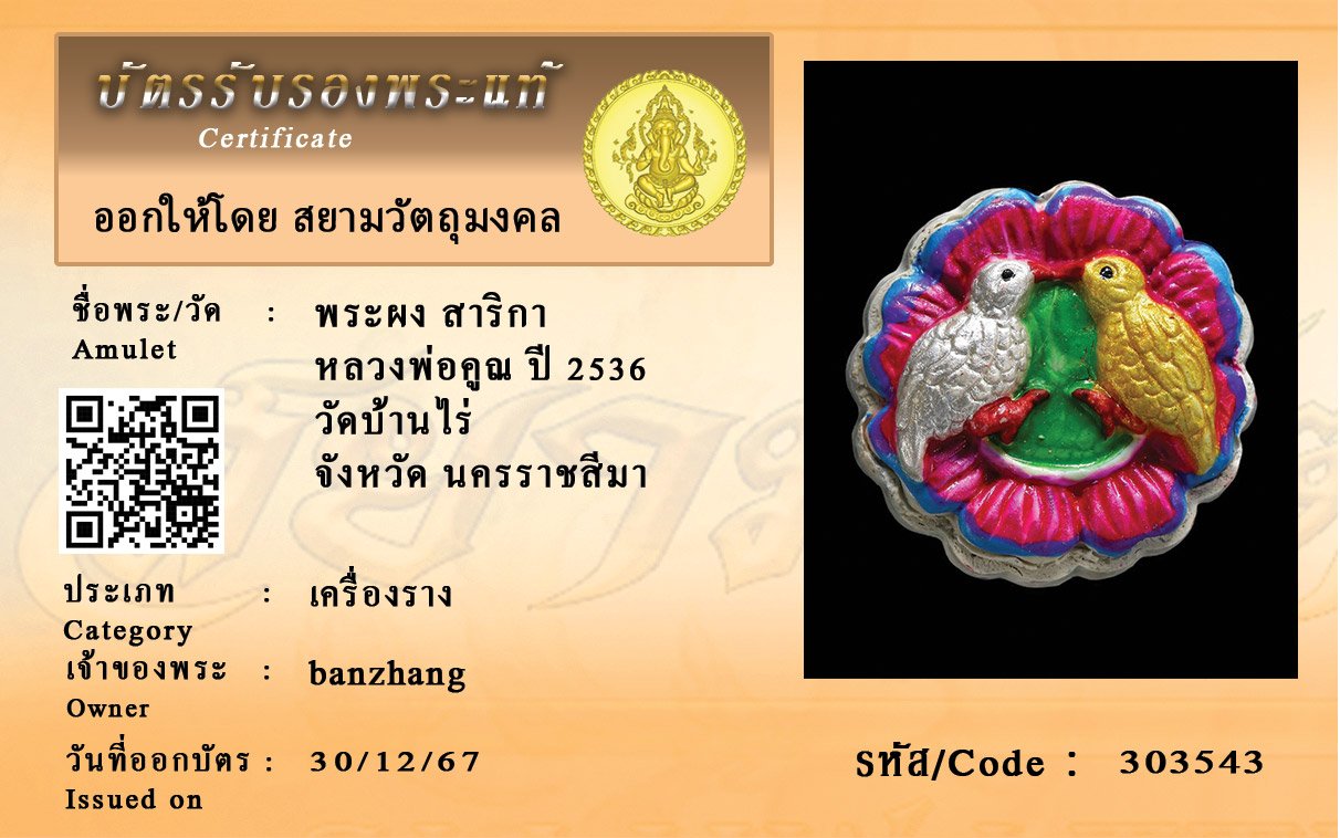 รหัสสินค้า : 303543 พระผง สาริกา หลวงพ่อคูณ ปี 2536 วัดบ้านไร่ จังหวัด นครราชสีมา