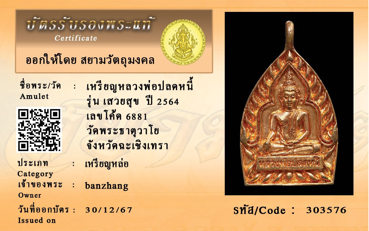 รหัสสินค้า : 303576 เหรียญหลวงพ่อปลดหนี้ รุ่น เสวยสุข ปี 2564 เลขโค้ด 6881 วัดพระธาตุวาโย จังหวัดฉะเชิงเทรา