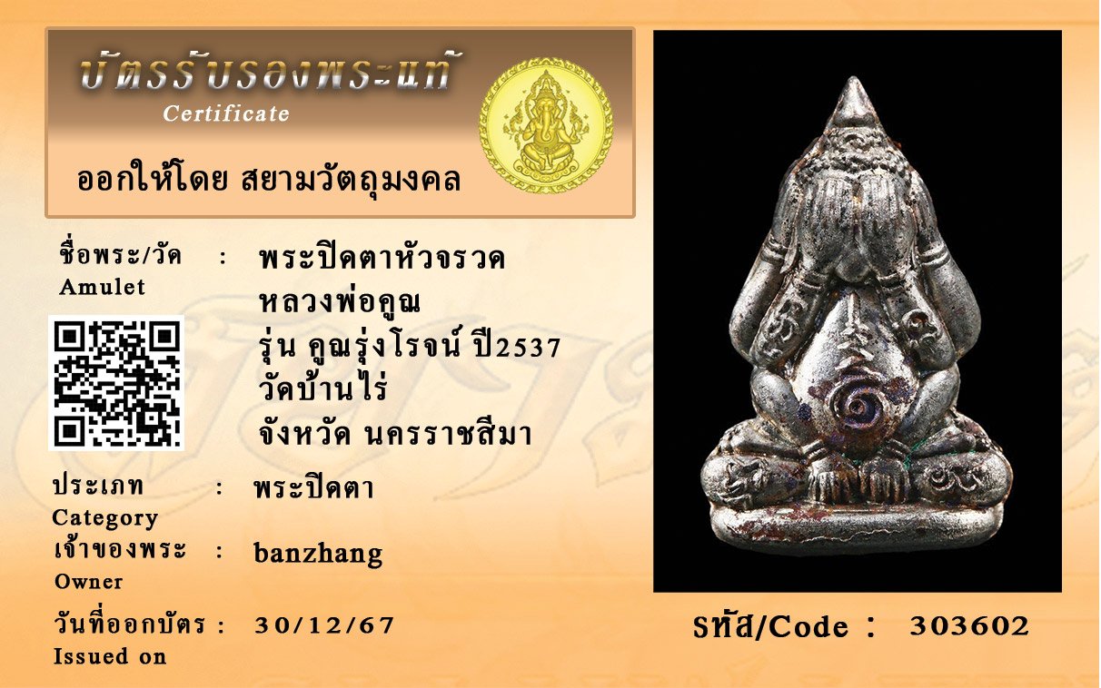 รหัสสินค้า : 303602 พระปิดตาหัวจรวด หลวงพ่อคูณ รุ่น คูณรุ่งโรจน์ ปี2537 วัดบ้านไร่ จังหวัด นครราชสีมา