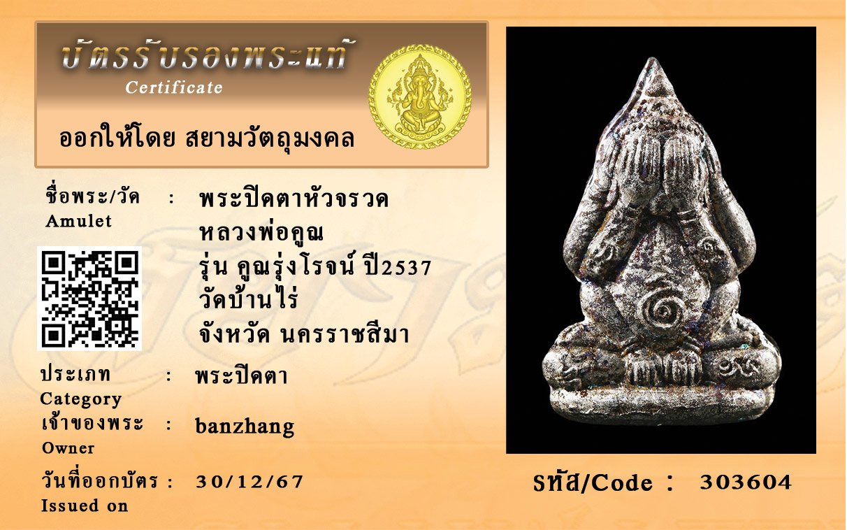 รหัสสินค้า : 303604 พระปิดตาหัวจรวด หลวงพ่อคูณ รุ่น คูณรุ่งโรจน์ ปี2537 วัดบ้านไร่ จังหวัด นครราชสีมา