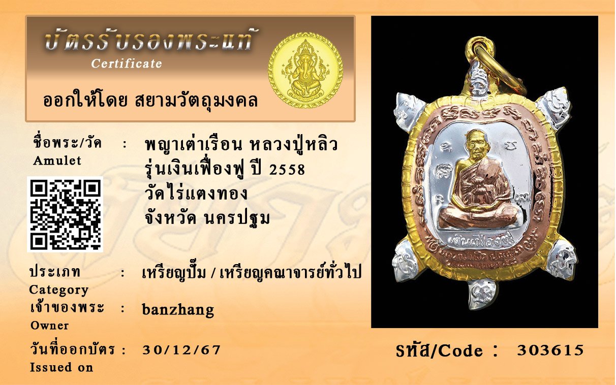 รหัสสินค้า : 303615 พญาเต่าเรือน หลวงปู่หลิว รุ่นเงินเฟื่องฟู ปี 2558 วัดไร่แตงทอง จังหวัด นครปฐม