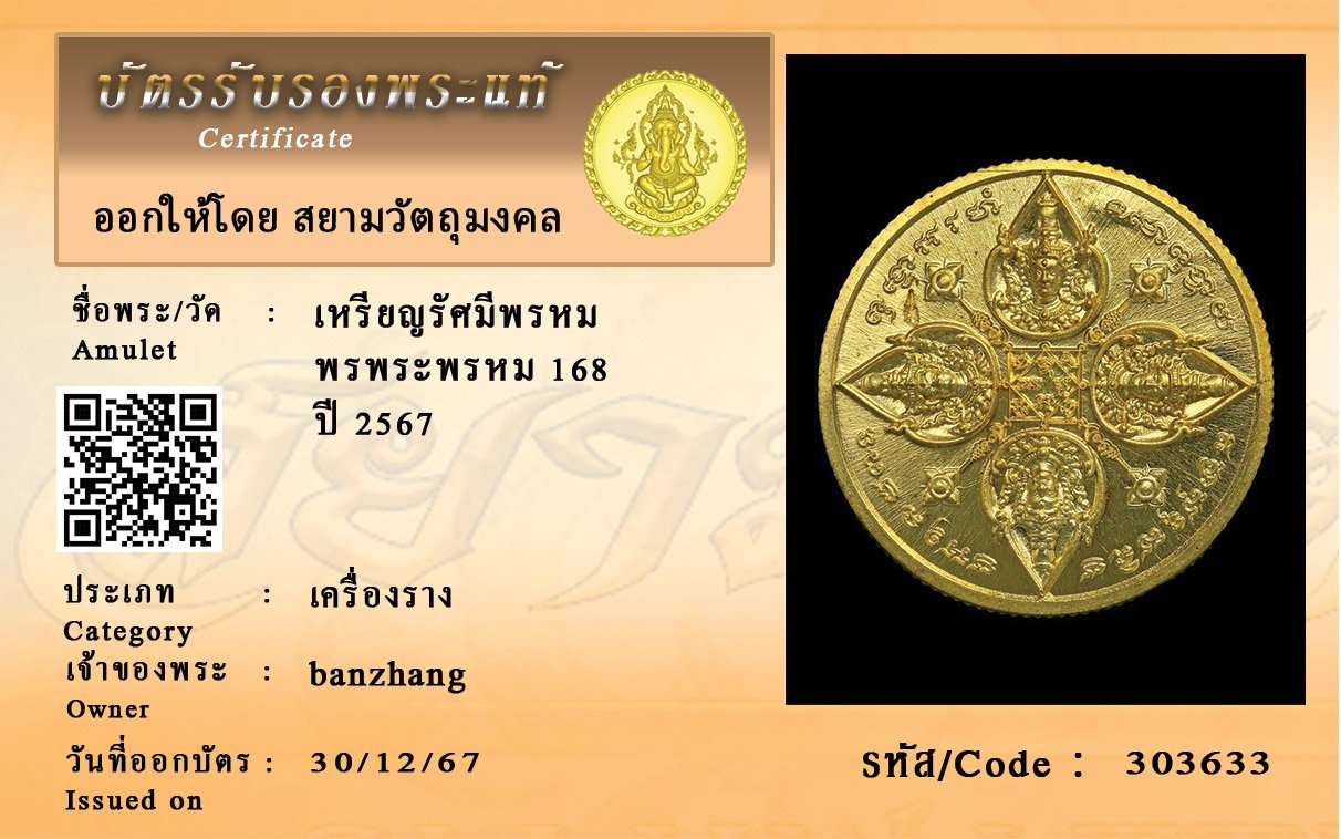 รหัสสินค้า : 303633 เหรียญรัศมีพรหม พรพระพรหม 168 ปี 2567