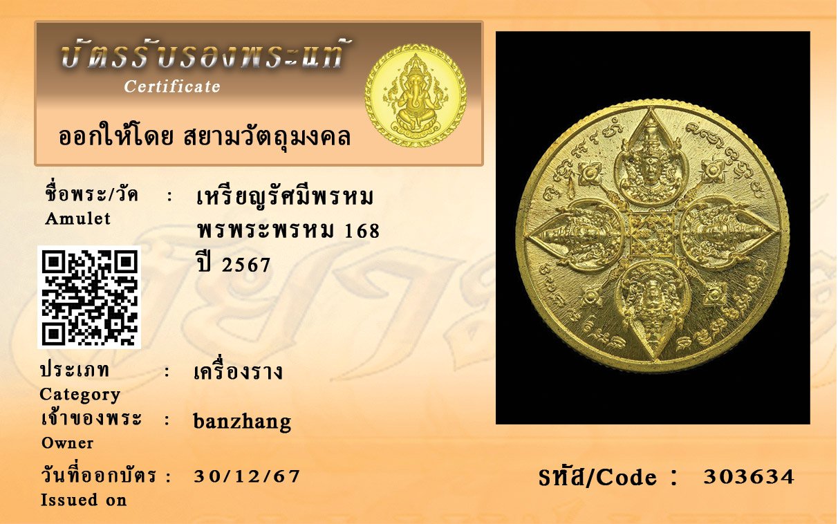 รหัสสินค้า : 303634 เหรียญรัศมีพรหม พรพระพรหม 168 ปี 2567