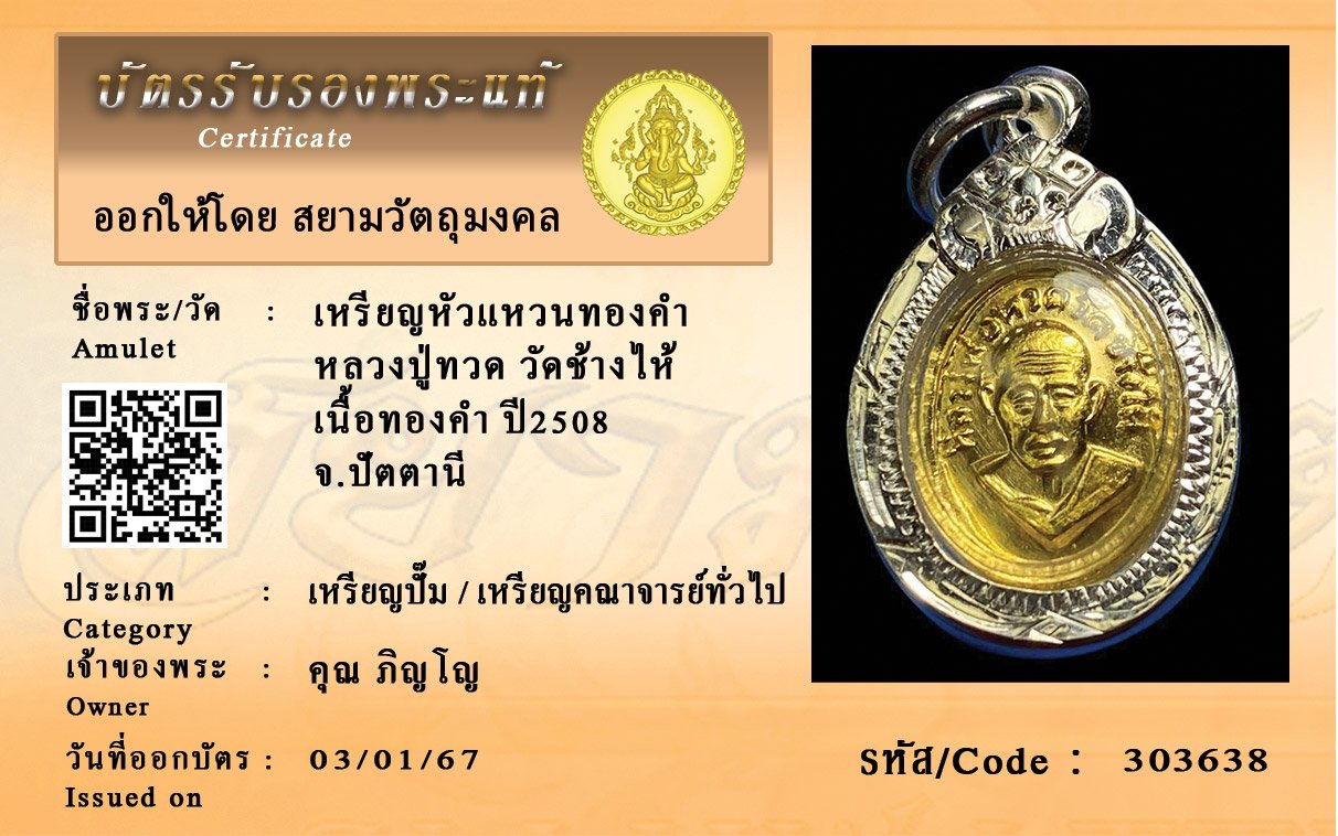 รหัสสินค้า : 303638 เหรียญหัวแหวนทองคำ หลวงปู่ทวด วัดช้างไห้ เนื้อทองคำ ปี2508 จ.ปัตตานี