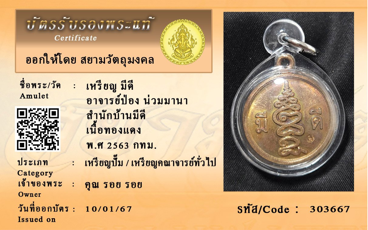 รหัสสินค้า : 303667 เหรียญ มีดี อาจารย์ป่อง น่วมมานา สำนักบ้านมีดี เนื้อทองแดง พ.ศ 2563 กทม.