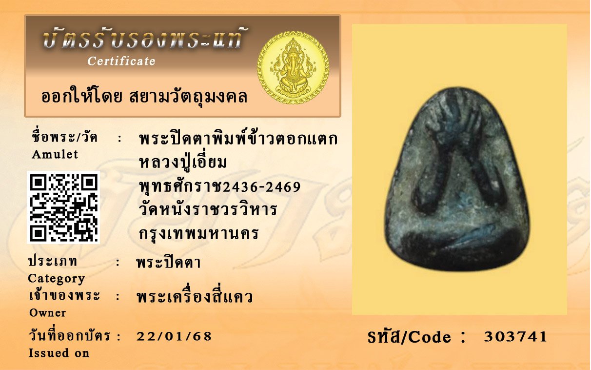 รหัสสินค้า : 303741 พระปิดตาพิมพ์ข้าวตอกแตก หลวงปู่เอี่ยม พุทธศักราช2436-2469 วัดหนังราชวรวิหาร กรุงเทพมหานคร