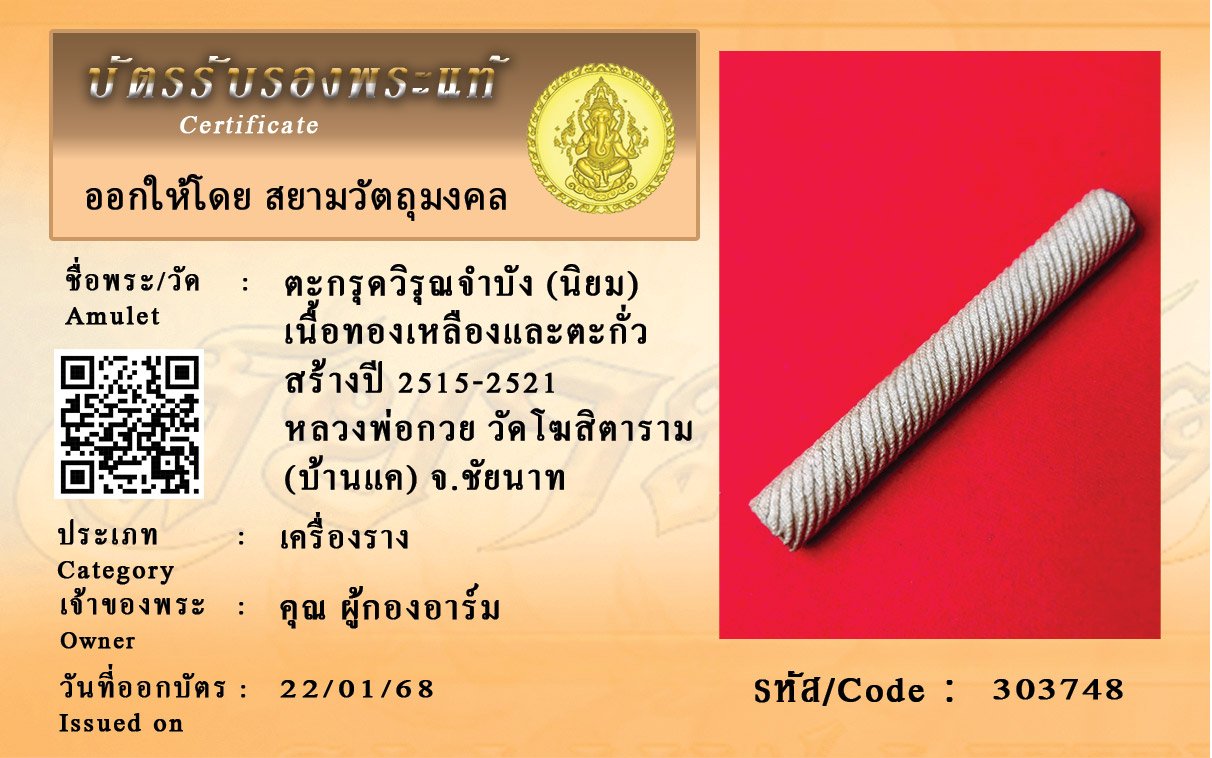รหัสสินค้า : 303748 ตะกรุดวิรุณจำบัง (นิยม) เนื้อทองเหลืองและตะกั่ว สร้างปี 2515-2521 หลวงพ่อกวย วัดโฆสิตาราม (บ้านแค) จ.ชัยนาท