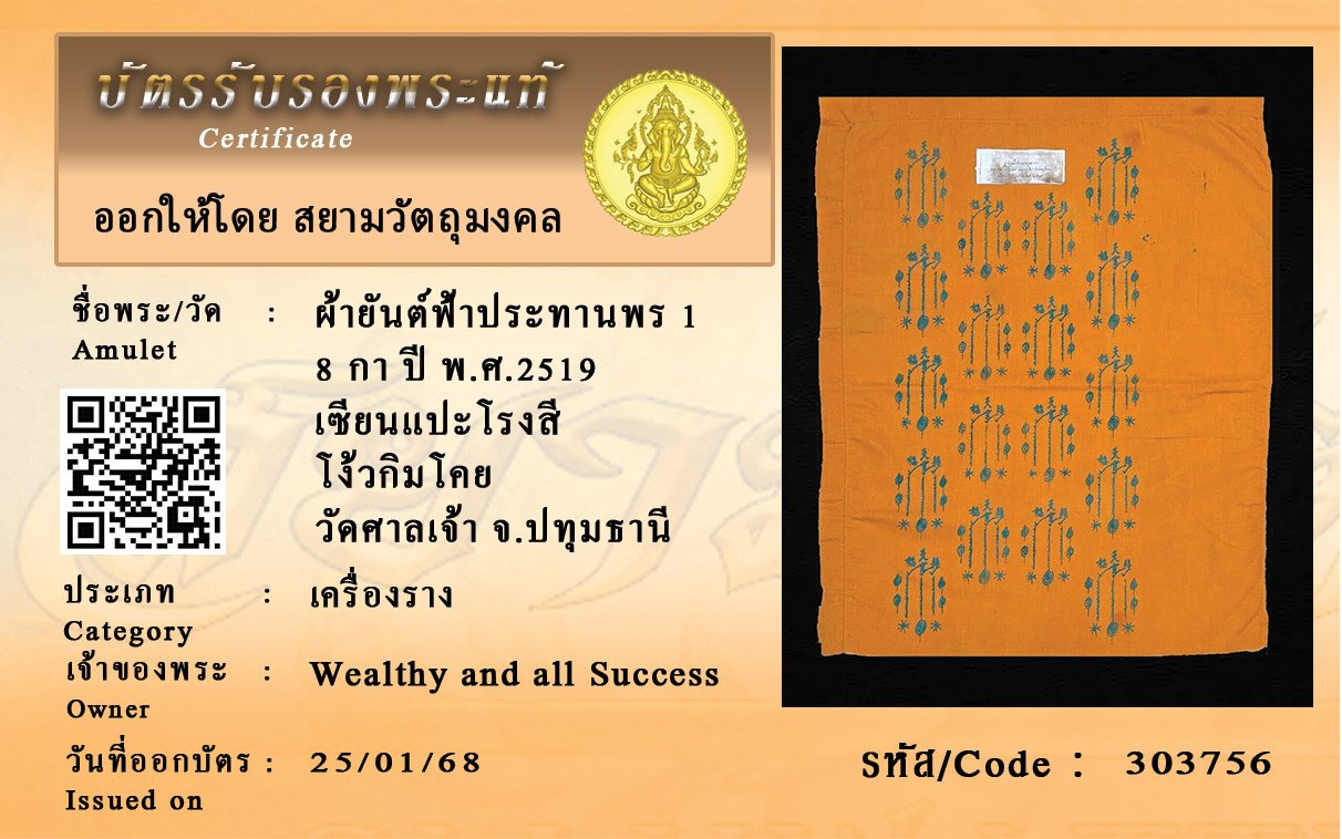 รหัสสินค้า : 303756 ผ้ายันต์ฟ้าประทานพร 1 8 กา ปี พ.ศ.2519 เซียนแปะโรงสี โง้วกิมโคย วัดศาลเจ้า จ.ปทุมธานี