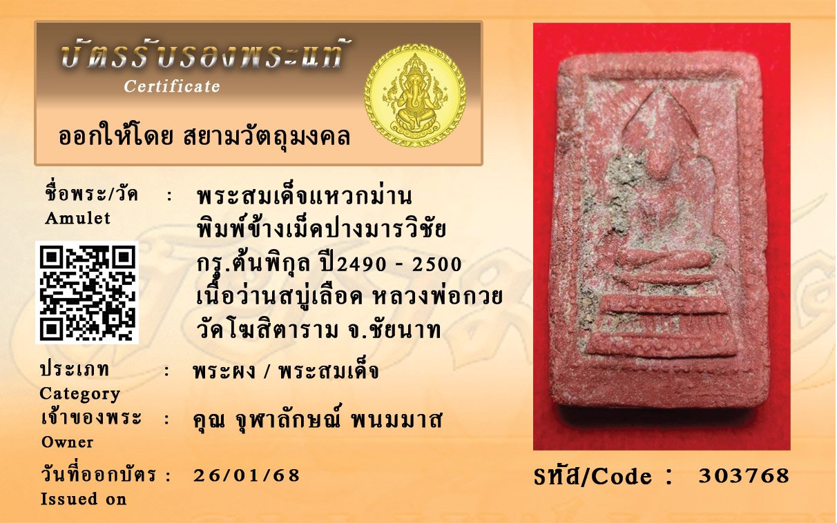 รหัสสินค้า : 303768 พระสมเด็จแหวกม่าน พิมพ์ข้างเม็ดปางมารวิชัย กรุ.ต้นพิกุล ปี2490 - 2500 เนื้อว่านสบู่เลือด หลวงพ่อกวย วัดโฆสิตาราม จ.ชัยนาท