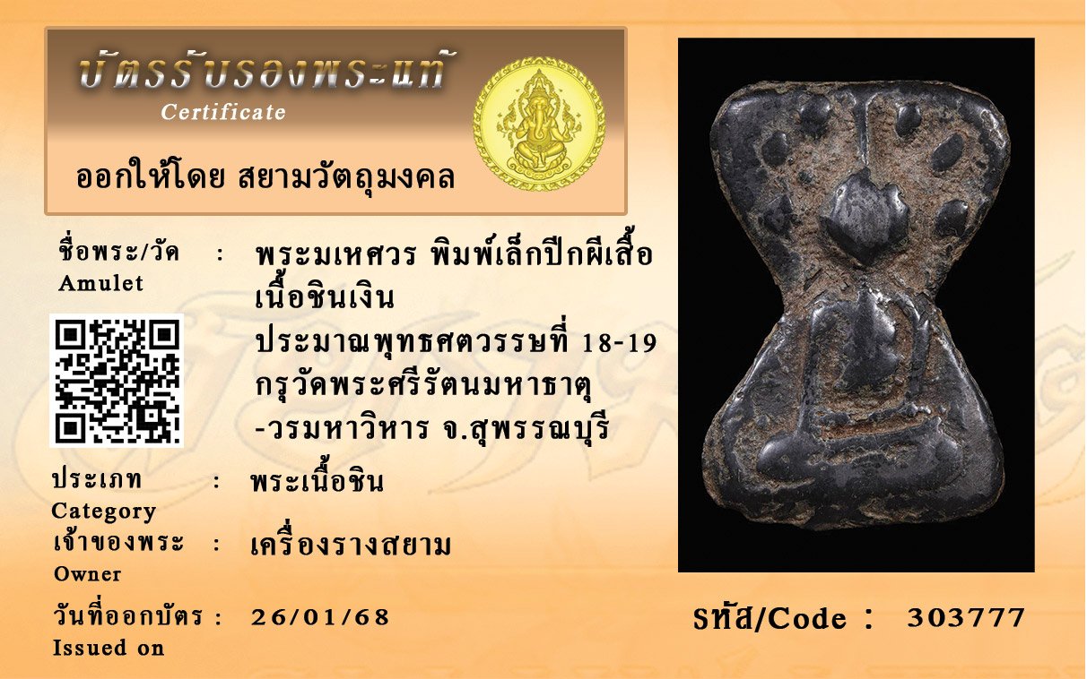 รหัสสินค้า : 303777 พระมเหศวร พิมพ์เล็กปีกผีเสื้อ เนื้อชินเงิน ประมาณพุทธศตวรรษที่ 18-19 กรุวัดพระศรีรัตนมหาธาตุ -วรมหาวิหาร จ.สุพรรณบุรี