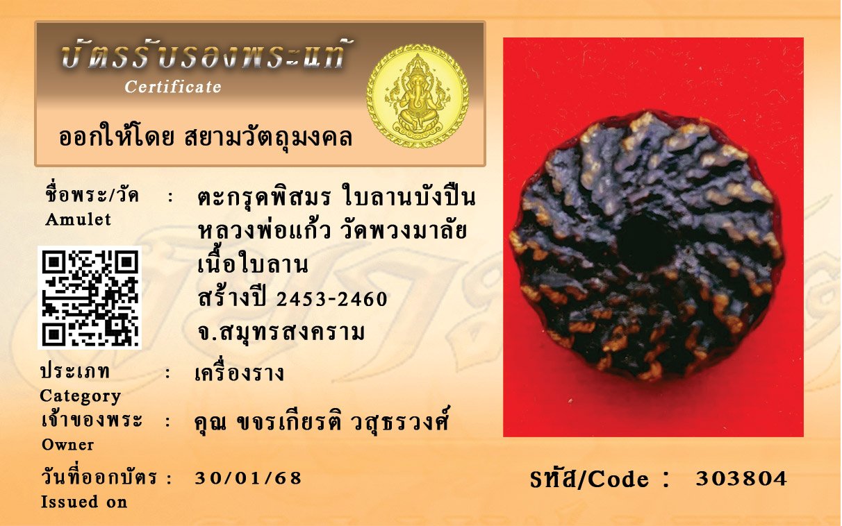 รหัสสินค้า : 303804 ตะกรุดพิสมร ใบลานบังปืน หลวงพ่อแก้ว วัดพวงมาลัย เนื้อใบลาน สร้างปี 2453-2460 จ.สมุทรสงคราม