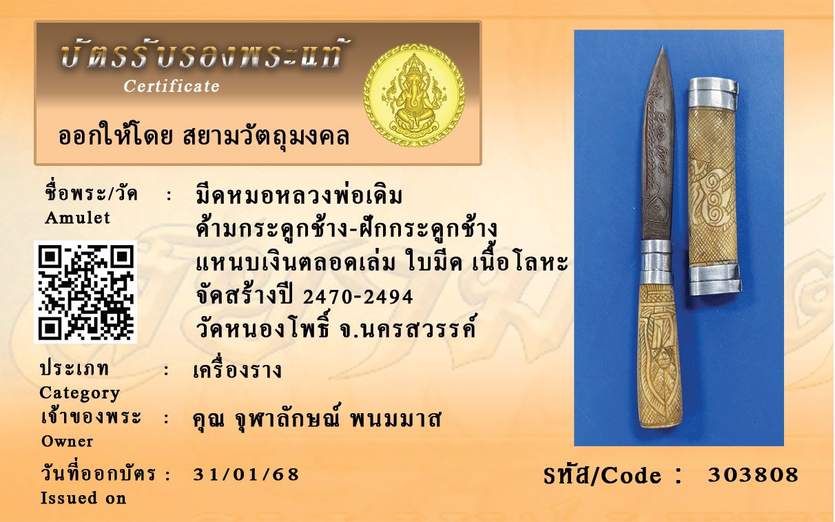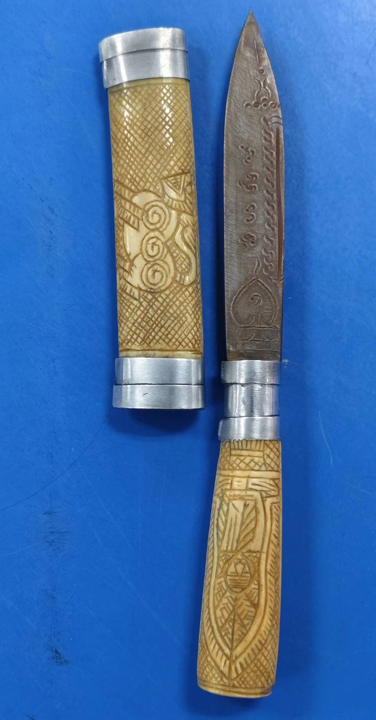 รหัสสินค้า : 303808 มีดหมอหลวงพ่อเดิม ด้ามกระดูกช้าง-ฝักกระดูกช้าง แหนบเงินตลอดเล่ม ใบมีด เนื้อโลหะ จัดสร้างปี 2470-2494 วัดหนองโพธิ์ จ.นครสวรรค์