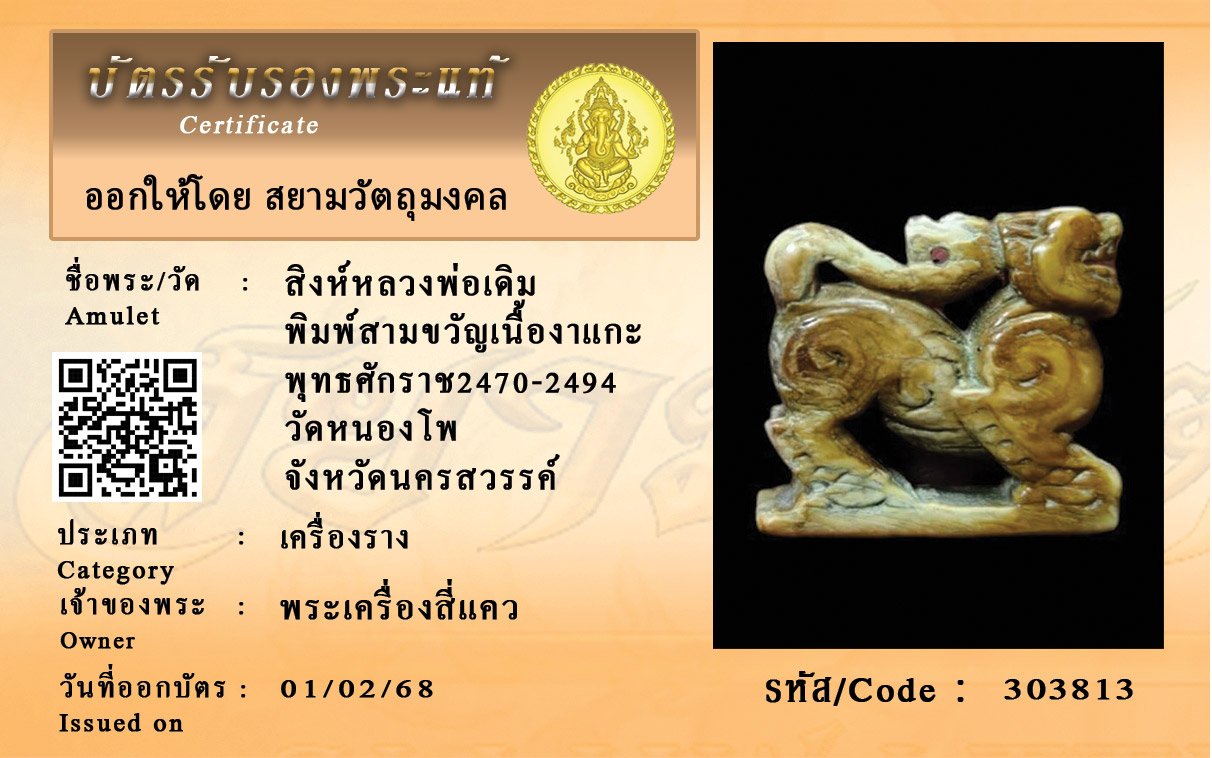 รหัสสินค้า : 303813 สิงห์หลวงพ่อเดิม พิมพ์สามขวัญเนื้องาแกะ พุทธศักราช2470-2494 วัดหนองโพ จังหวัดนครสวรรค์