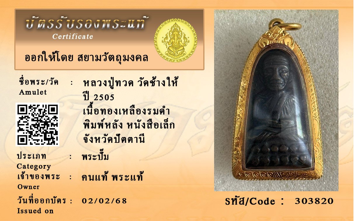 รหัสสินค้า : 303820 หลวงปู่ทวด วัดช้างให้ ปี 2505 เนื้อทองเหลืองรมดำ พิมพ์หลัง หนังสือเล็ก จังหวัดปัตตานี