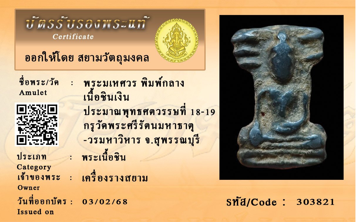 รหัสสินค้า : 303821 พระมเหศวร พิมพ์กลาง เนื้อชินเงิน ประมาณพุทธศตวรรษที่ 18-19 กรุวัดพระศรีรัตนมหาธาตุ -วรมหาวิหาร จ.สุพรรณบุรี