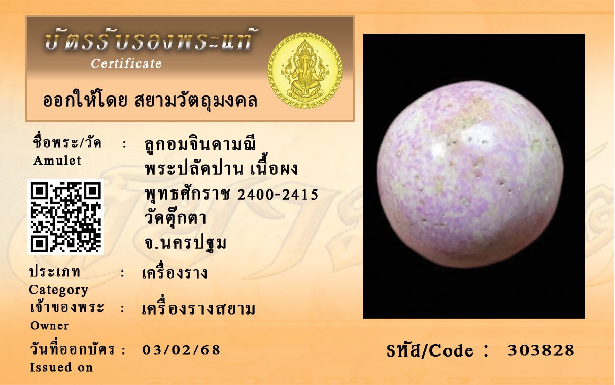 รหัสสินค้า : 303828 ลูกอมจินดามณี พระปลัดปาน เนื้อผง พุทธศักราช 2400-2415 วัดตุ๊กตา จ.นครปฐม