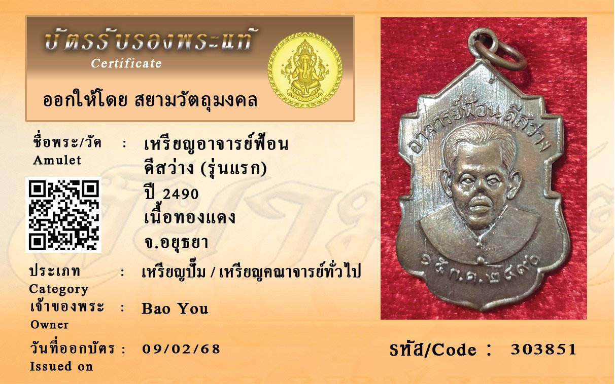 รหัสสินค้า : 303851 เหรียญอาจารย์ฟ้อน ดีสว่าง (รุ่นแรก) ปี 2490 เนื้อทองแดง จ.อยุธยา