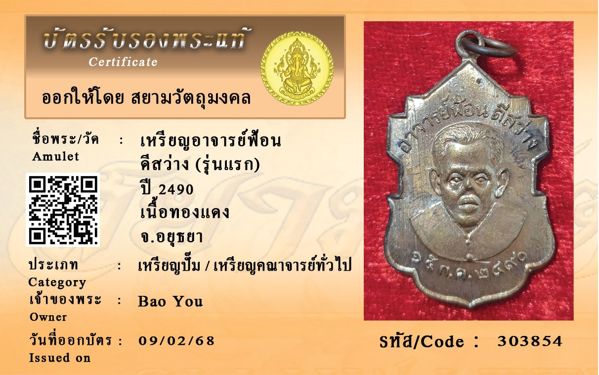 รหัสสินค้า : 303854 เหรียญอาจารย์ฟ้อน ดีสว่าง (รุ่นแรก) ปี 2490 เนื้อทองแดง จ.อยุธยา