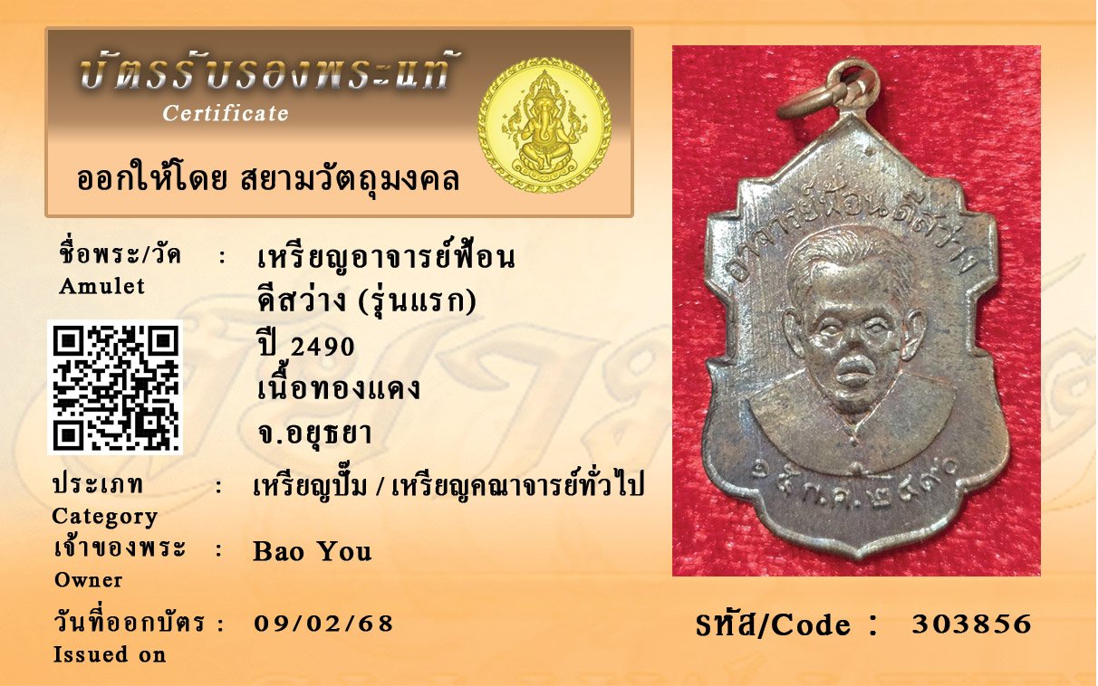 รหัสสินค้า : 303856 เหรียญอาจารย์ฟ้อน ดีสว่าง (รุ่นแรก) ปี 2490 เนื้อทองแดง จ.อยุธยา