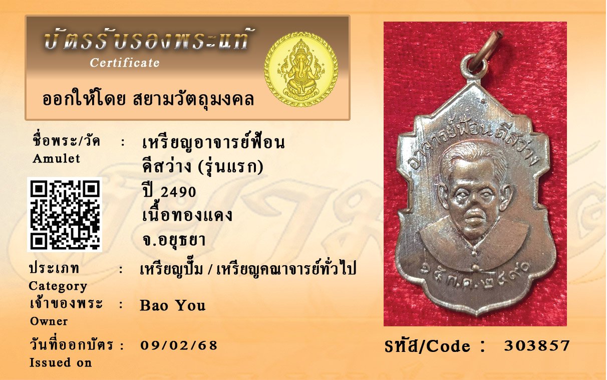 รหัสสินค้า : 303857 เหรียญอาจารย์ฟ้อน ดีสว่าง (รุ่นแรก) ปี 2490 เนื้อทองแดง จ.อยุธยา