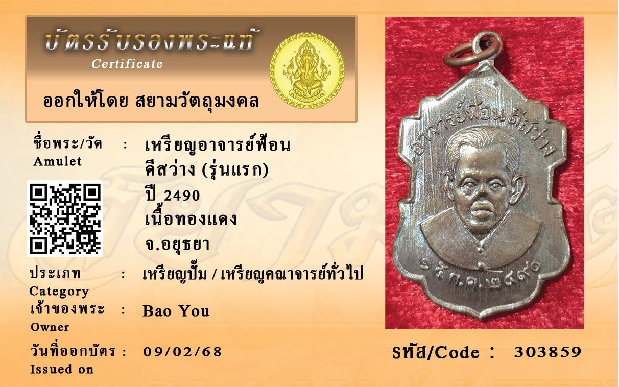 รหัสสินค้า : 303859 เหรียญอาจารย์ฟ้อน ดีสว่าง (รุ่นแรก) ปี 2490 เนื้อทองแดง จ.อยุธยา