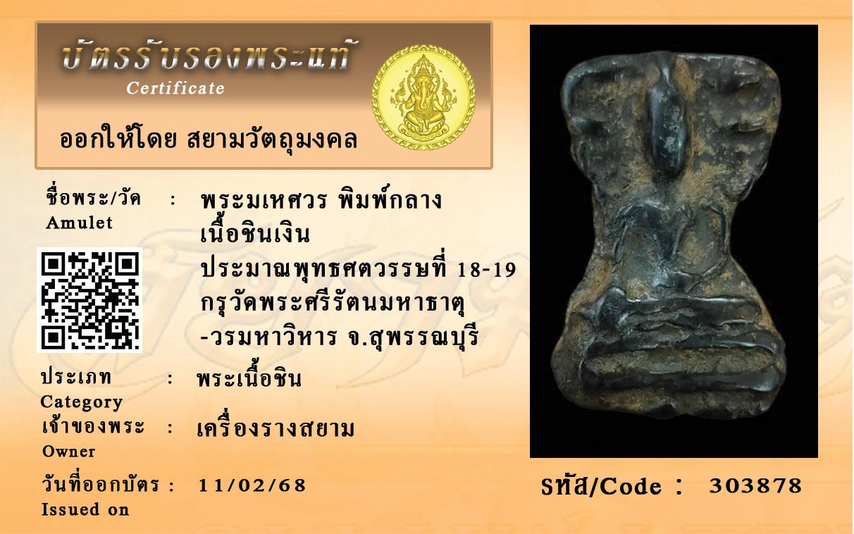 รหัสสินค้า : 303878 พระมเหศวร พิมพ์กลาง เนื้อชินเงิน ประมาณพุทธศตวรรษที่ 18-19 กรุวัดพระศรีรัตนมหาธาตุ -วรมหาวิหาร จ.สุพรรณบุรี