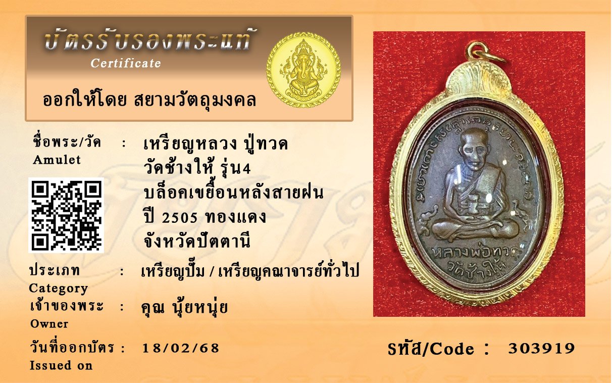 รหัสสินค้า : 303919 เหรียญหลวง ปู่ทวด วัดช้างให้ รุ่น4 บล็อคเขยื้อนหลังสายฝน ปี 2505 ทองแดง จังหวัดปัตตานี
