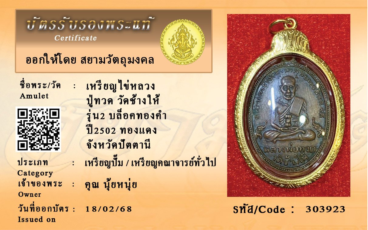 รหัสสินค้า : 303923 เหรียญไข่หลวง ปู่ทวด วัดช้างให้ รุ่น2 บล็อคทองคำ ปี2502 ทองแดง จังหวัดปัตตานี