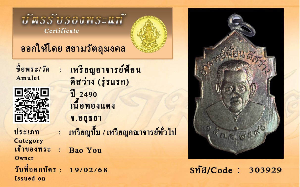 รหัสสินค้า : 303929 เหรียญอาจารย์ฟ้อน ดีสว่าง (รุ่รแรก) ปี 2490 เนื้อทองแดง จ.อยุธยา