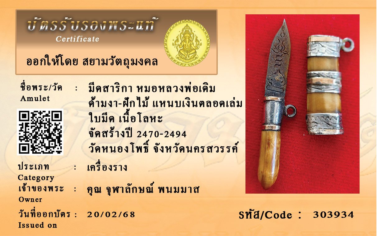 รหัสสินค้า : 303934 มีดสาริกา หมอหลวงพ่อเดิม ด้ามงา-ฝักไม้ แหนบเงินตลอดเล่ม ใบมีด เนื้อโลหะ จัดสร้างปี 2470-2494 วัดหนองโพธิ์ จังหวัดนครสวรรค์