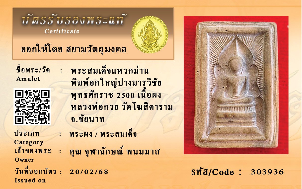 รหัสสินค้า : 303936 พระสมเด็จแหวกม่าน พิมพ์อกใหญ่ปางมารวิชัย พุทธศักราช 2500 เนื้อผง หลวงพ่อกวย วัดโฆสิตาราม จ.ชัยนาท