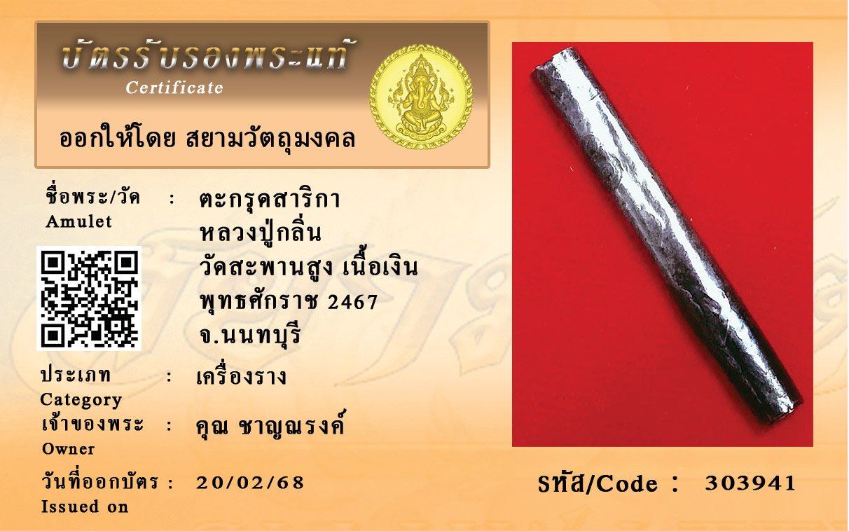 รหัสสินค้า : 303941 ตะกรุดสาริกา หลวงปู่กลิ่น วัดสะพานสูง เนื้อเงิน พุทธศักราช 2467 จ.นนทบุรี