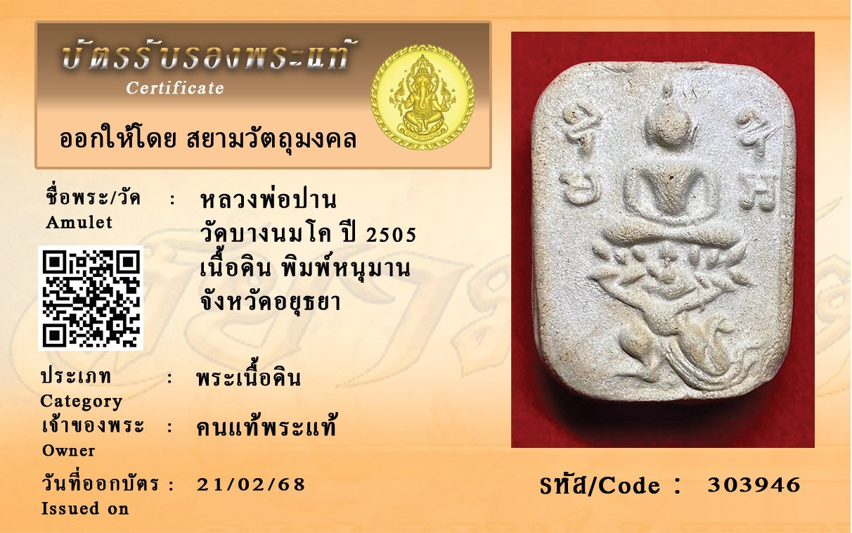 รหัสสินค้า : 303946 หลวงพ่อปาน วัดบางนมโค ปี 2505 เนื้อดิน พิมพ์หนุมาน จังหวัดอยุธยา