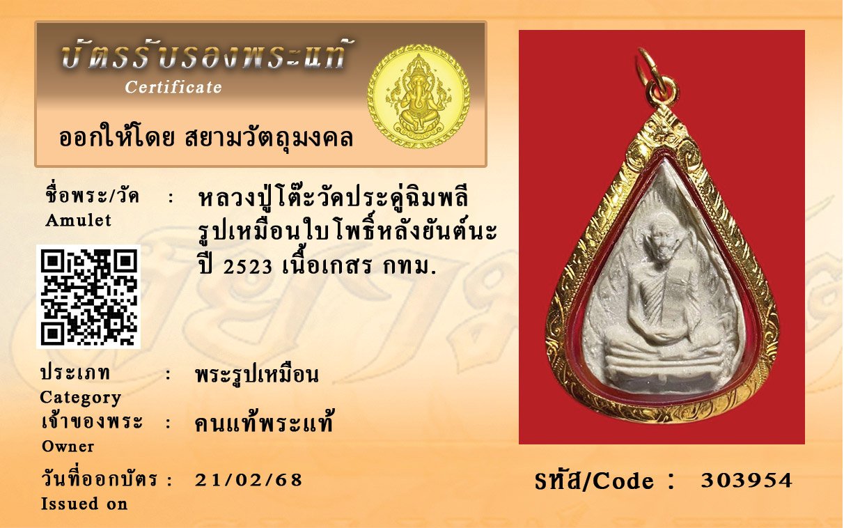 รหัสสินค้า : 303954 หลวงปู่โต๊ะวัดประดู่ฉิมพลี รูปเหมือนใบโพธิ์หลังยันต์นะ ปี 2523 เนื้อเกสร กทม.