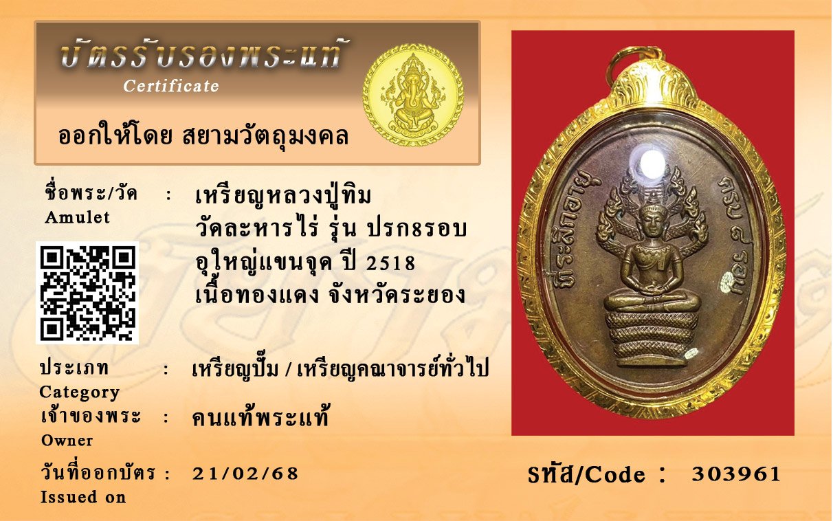 รหัสสินค้า : 303961 เหรียญหลวงปู่ทิม วัดละหารไร่ รุ่น ปรก8รอบ อุใหญ่แขนจุด ปี 2518 เนื้อทองแดง จังหวัดระยอง