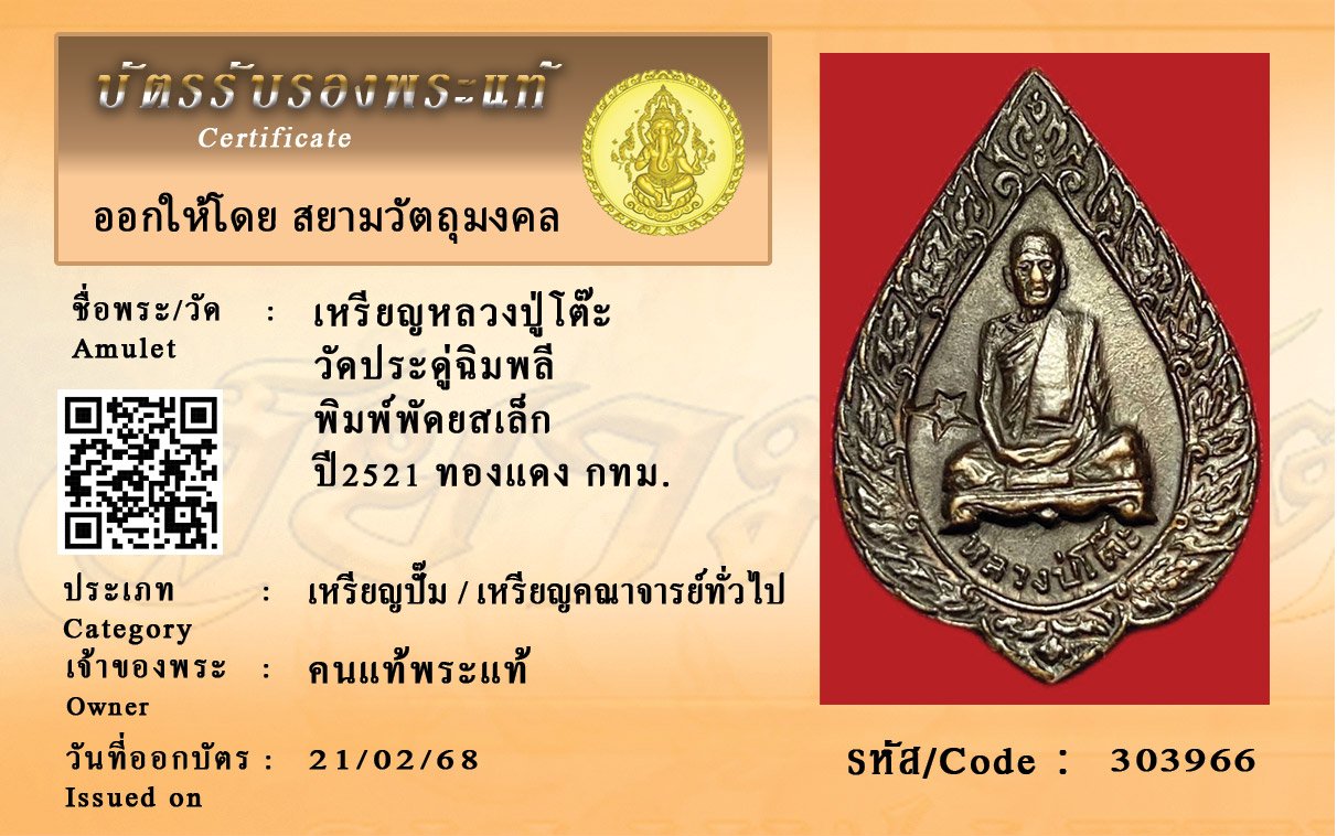 รหัสสินค้า : 303966 เหรียญหลวงปู่โต๊ะ วัดประดู่ฉิมพลี พิมพ์พัดยสเล็ก ปี2521 ทองแดง กทม.