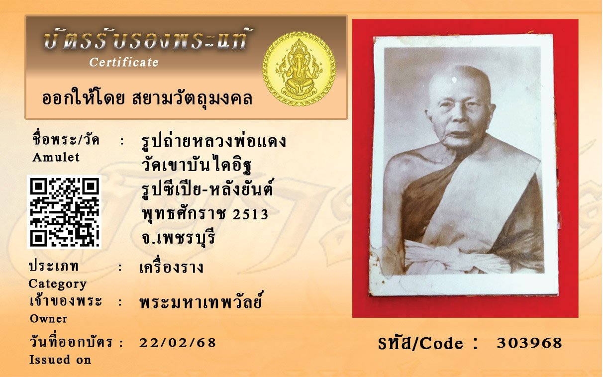 รหัสสินค้า : 303968 รูปถ่ายหลวงพ่อแดง วัดเขาบันไดอิฐ รูปซีเปีย-หลังยันต์ พุทธศักราช 2513 จ.เพชรบุรี