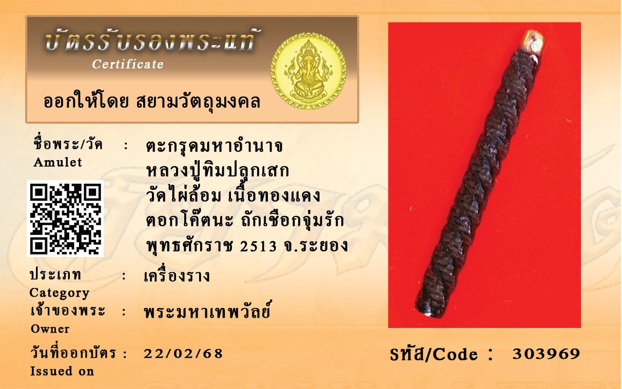 รหัสสินค้า : 303969 ตะกรุดมหาอำนาจ หลวงปู่ทิมปลุกเสก วัดไผ่ล้อม เนื้อทองแดง ตอกโค๊ตนะ ถักเชือกจุ่มรัก พุทธศักราช 2513 จ.ระยอง