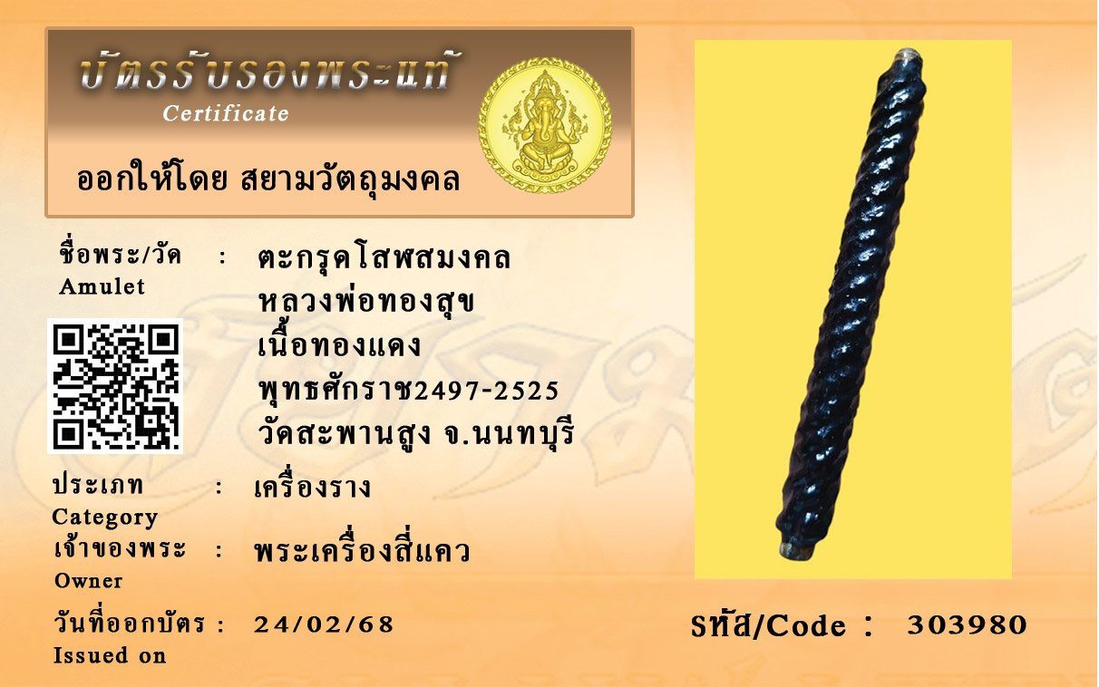 รหัสสินค้า : 303980 ตะกรุดโสฬสมงคล หลวงพ่อทองสุข เนื้อทองแดง พุทธศักราช2497-2525 วัดสะพานสูง จ.นนทบุรี