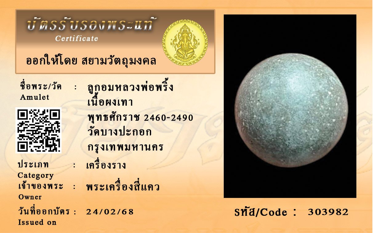 รหัสสินค้า : 303982 ลูกอมหลวงพ่อพริ้ง เนื้อผงเทา พุทธศักราช 2460-2490 วัดบางปะกอก กรุงเทพมหานคร