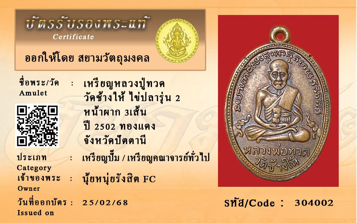 รหัสสินค้า : 304002 เหรียญหลวงปู่ทวด วัดช้างให้ ไข่ปลารุ่น 2 หน้าผาก 3เส้น ปี 2502 ทองแดง จังหวัดปัตตานี