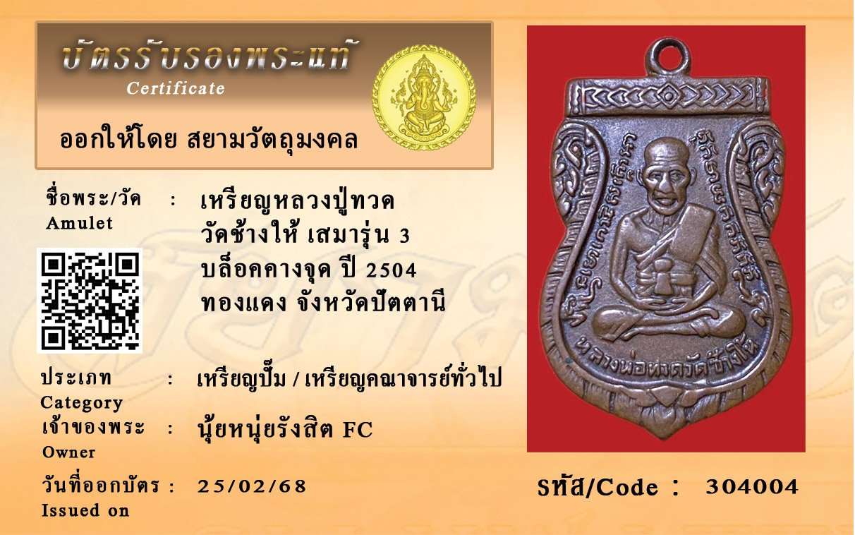 รหัสสินค้า : 304004 เหรียญหลวงปู่ทวด วัดช้างให้ เสมารุ่น 3 บล็อคคางจุด ปี 2504 ทองแดง จังหวัดปัตตานี