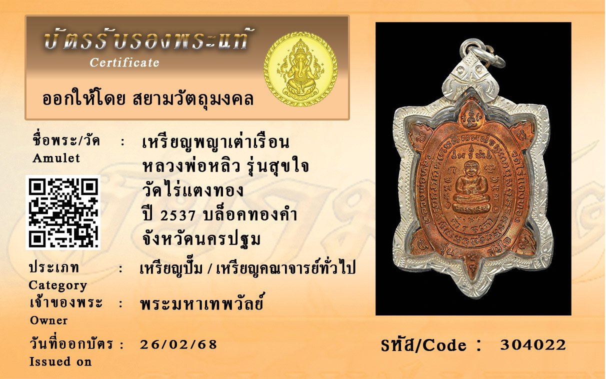 รหัสสินค้า : 304022 เหรียญพญาเต่าเรือน หลวงพ่อหลิว รุ่นสุขใจ วัดไร่แตงทอง ปี 2537 บล็อคทองคำ จังหวัดนครปฐม