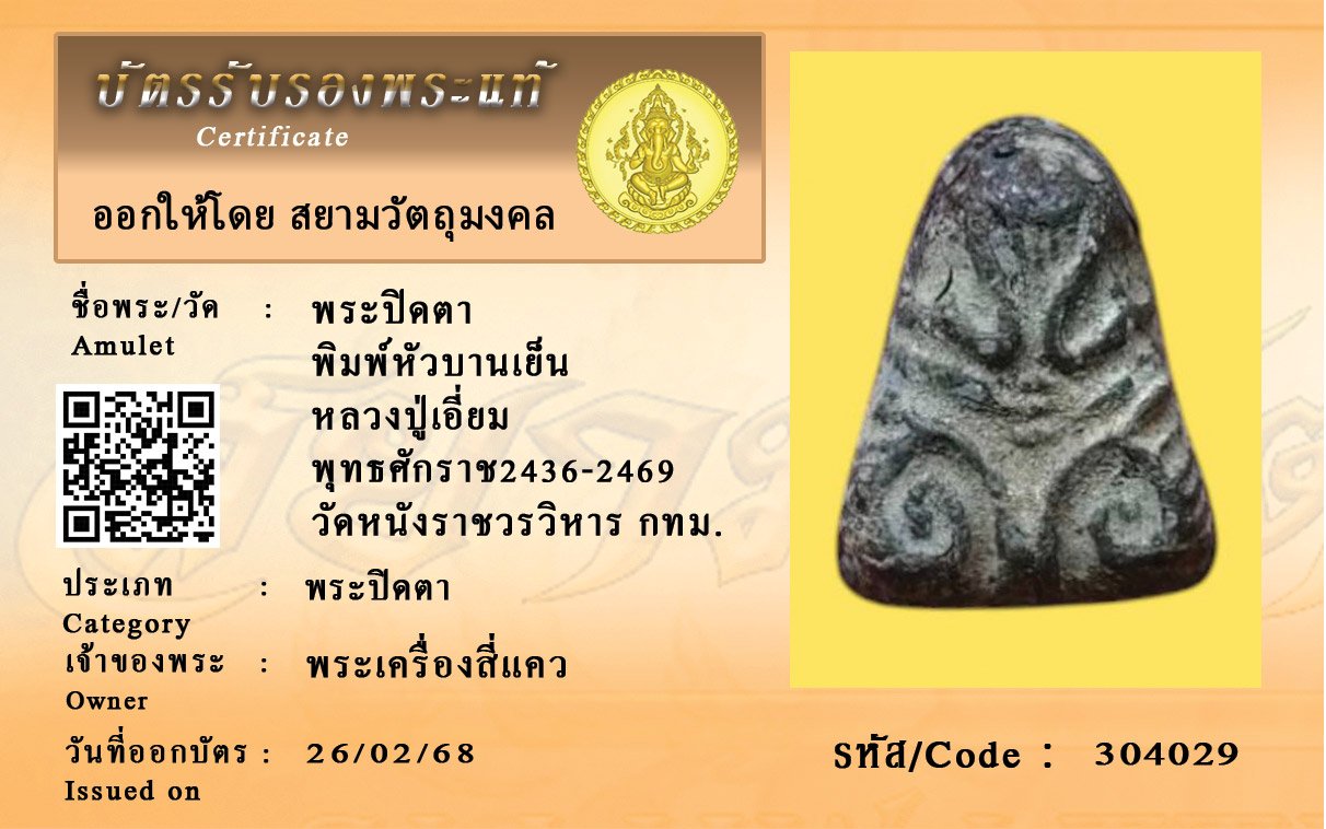 รหัสสินค้า : 304029 พระปิดตา พิมพ์หัวบานเย็น หลวงปู่เอี่ยม พุทธศักราช2436-2469 วัดหนังราชวรวิหาร กทม.