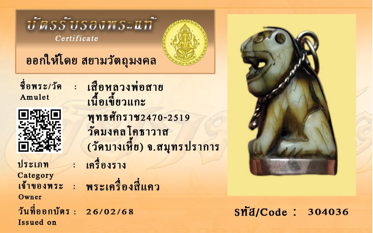 รหัสสินค้า : 304036 เสือหลวงพ่อสาย เนื้อเขี้ยวแกะ พุทธศักราช2470-2519 วัดมงคลโคธาวาส (วัดบางเหี้ย) จ.สมุทรปราการ