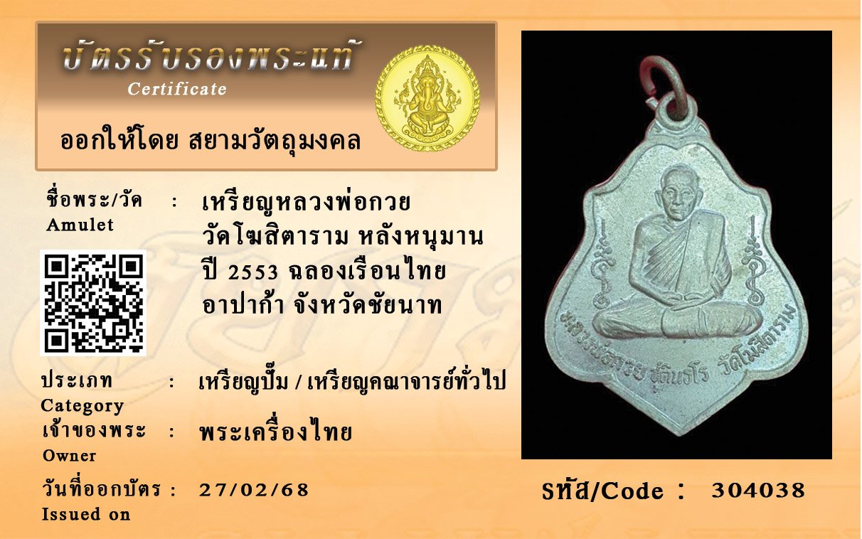 รหัสสินค้า : 304038 เหรียญหลวงพ่อกวย วัดโฆสิตาราม หลังหนุมาน ปี 2553 ฉลองเรือนไทย อาปาก้า จังหวัดชัยนาท