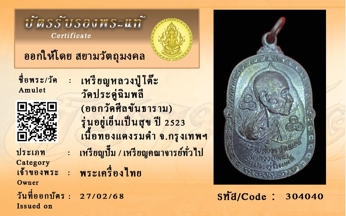 รหัสสินค้า : 304040 เหรียญหลวงปู่โต๊ะ วัดประดู่ฉิมพลี (ออกวัดศีลขันธาราม) รุ่นอยู่เย็นเป็นสุข ปี 2523 เนื้อทองแดงรมดำ จ.กรุงเทพฯ