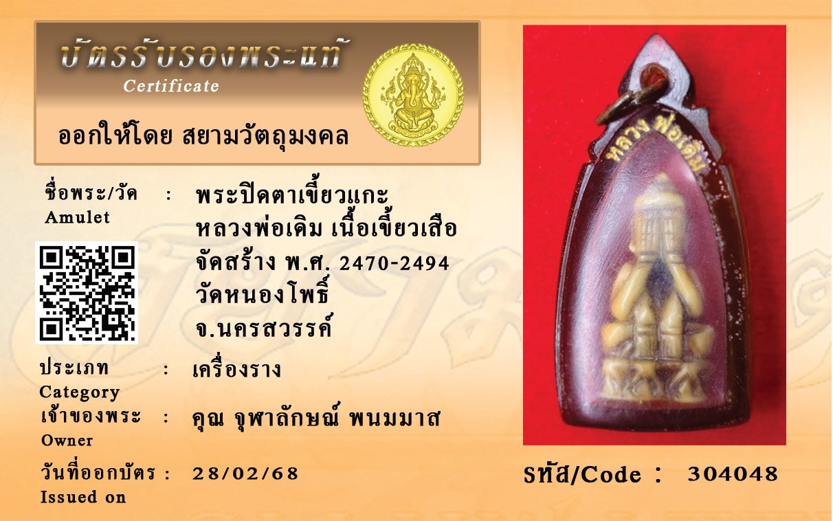 รหัสสินค้า : 304048 พระปิดตาเขี้ยวแกะ หลวงพ่อเดิม เนื้อเขี้ยวเสือ จัดสร้าง พ.ศ. 2470-2494 วัดหนองโพธิ์ จ.นครสวรรค์