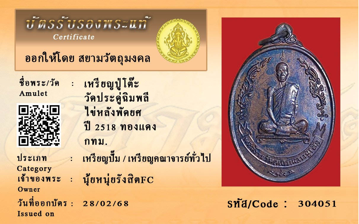 รหัสสินค้า : 304051 เหรียญปู่โต๊ะ วัดประดู่ฉิมพลี ไข่หลังพัดยศ ปี 2518 ทองแดง กทม.