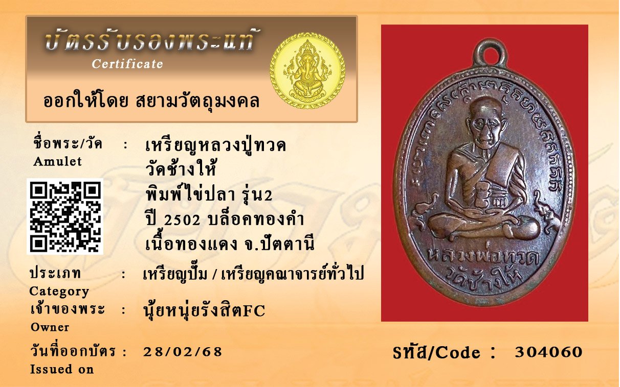 รหัสสินค้า : 304060 เหรียญหลวงปู่ทวด วัดช้างให้ พิมพ์ไข่ปลา รุ่น2 ปี 2502 บล็อคทองคำ เนื้อทองแดง จังหวัดปัตตานี